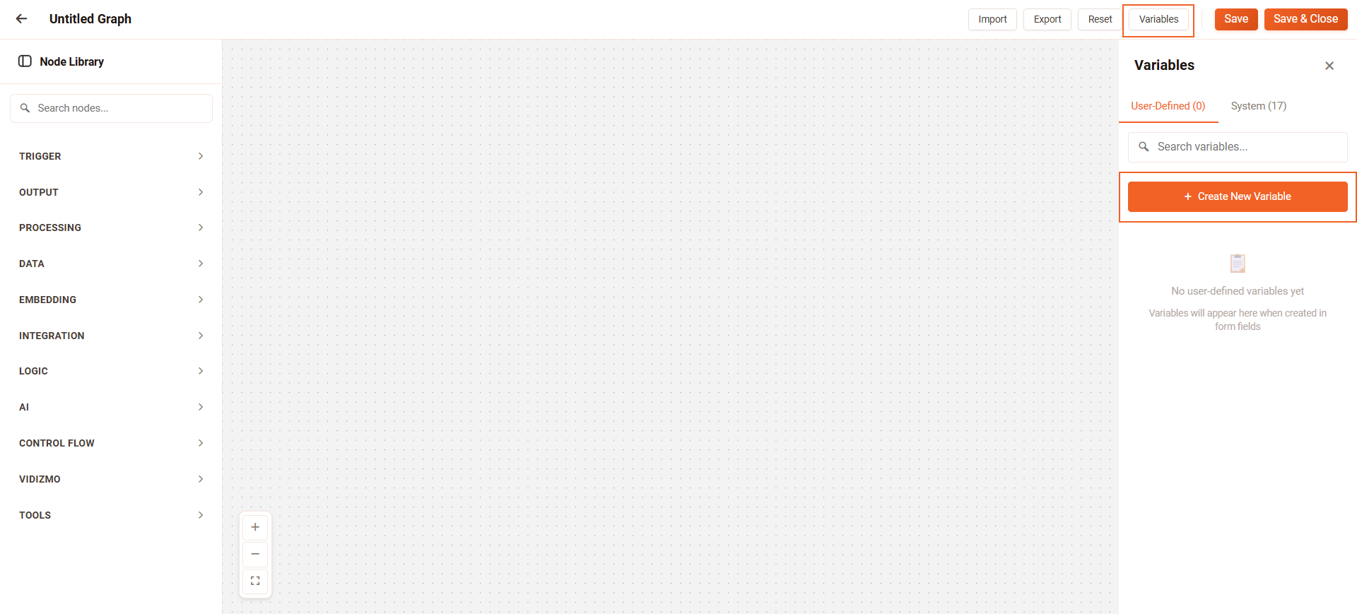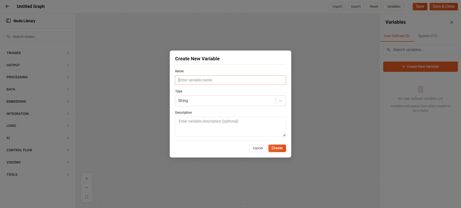Variables in VIDIZMO Agentic AI allow you to store reusable values and reference them across nodes and workflows. User-defined variables provide flexibility for storing custom values, while system variables supply global context that cannot be modified.