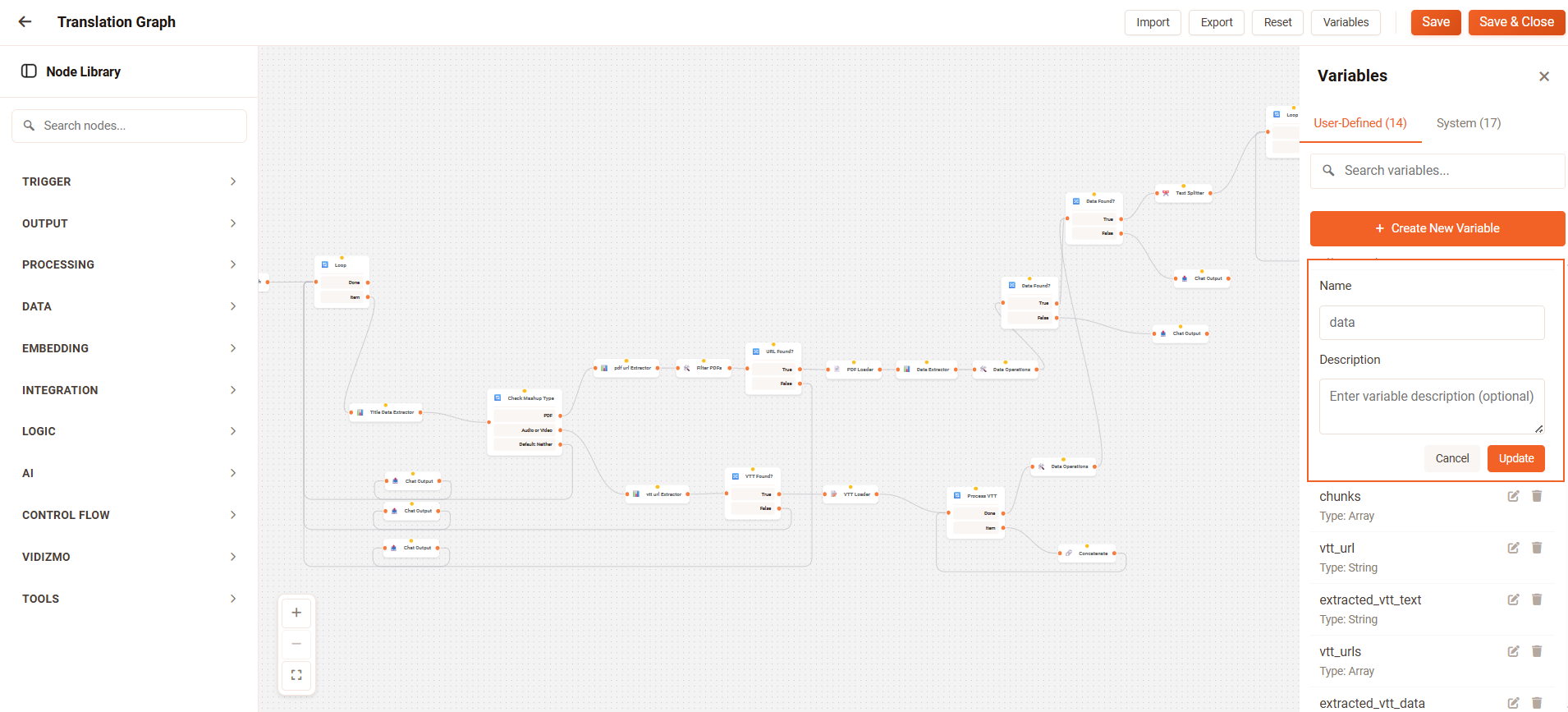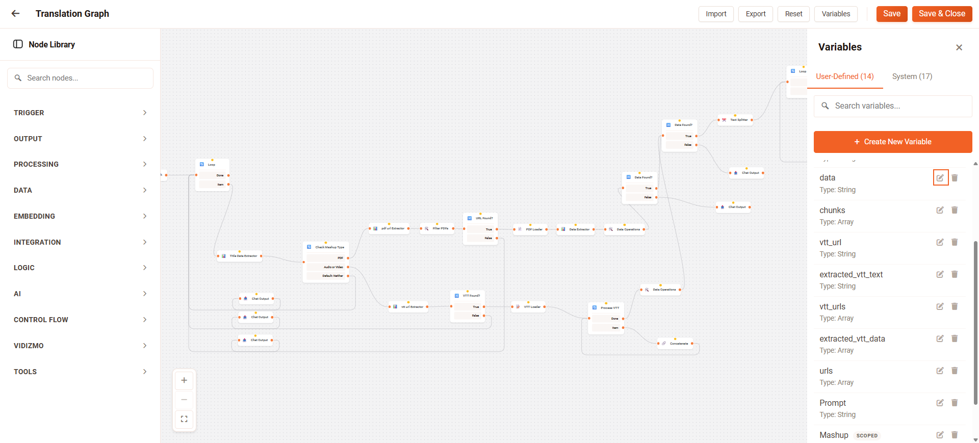 Variables allow you to store reusable values that can be referenced across workflows in VIDIZMO Agentic AI. They help improve consistency, simplify maintenance, and reduce the need for repeating values across multiple nodes.