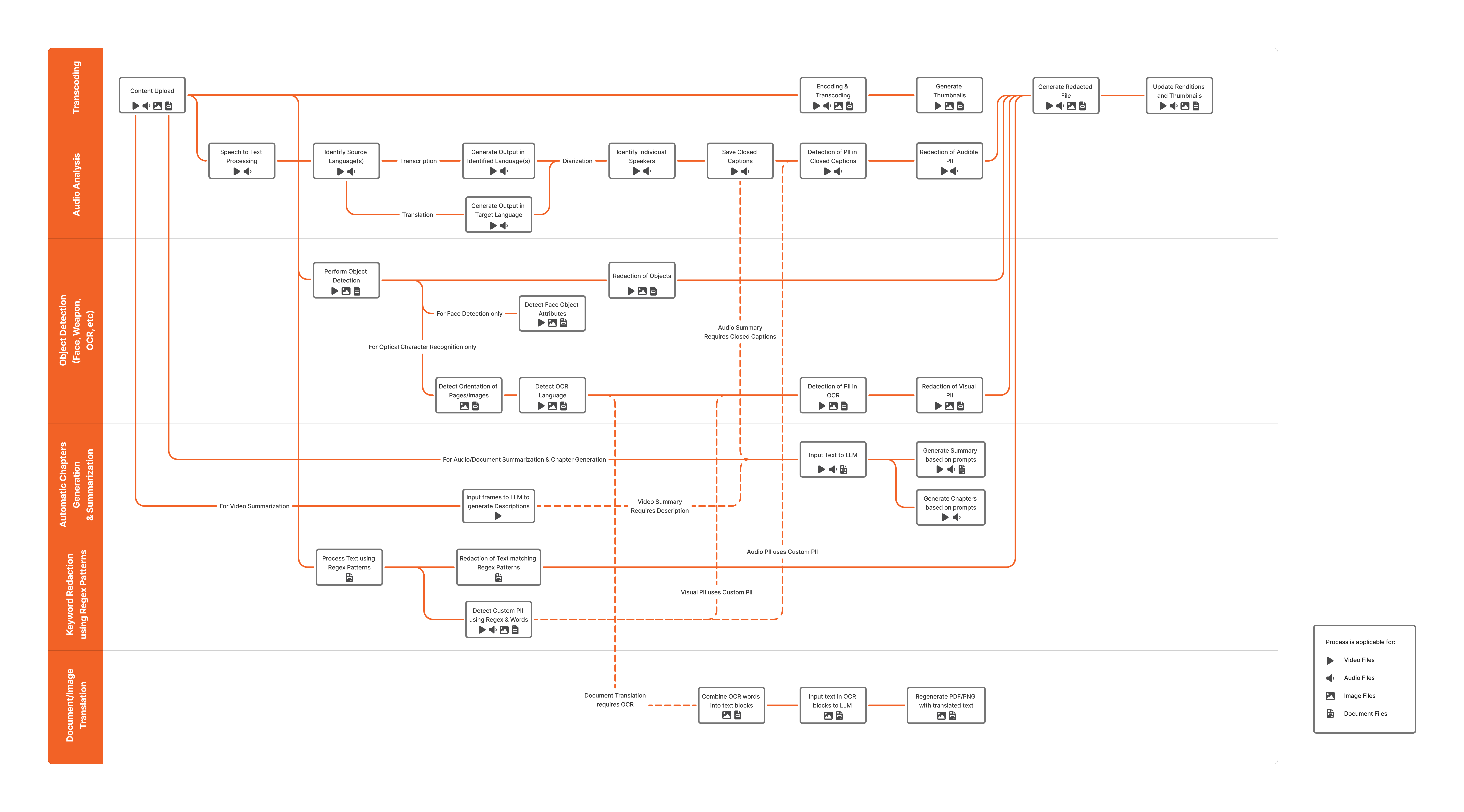| Video files | Transcoding, transcription, translation, object detection, face detection, OCR, summarization, chapter generation, PII redaction |