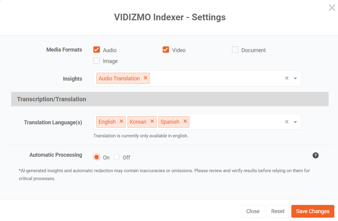 - Make sure Transcription/Closed Caption (CC) and Audio Translation are both selected in the VIDIZMO Indexer settings.