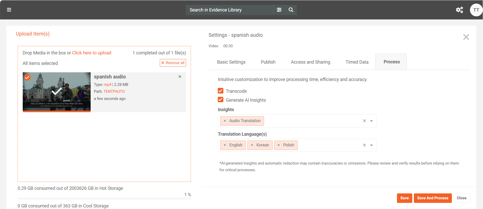 - Go to the audio or video file you want to translate. From the overflow menu, choose Process. To translate multiple files, select them and choose Process from the header menu.