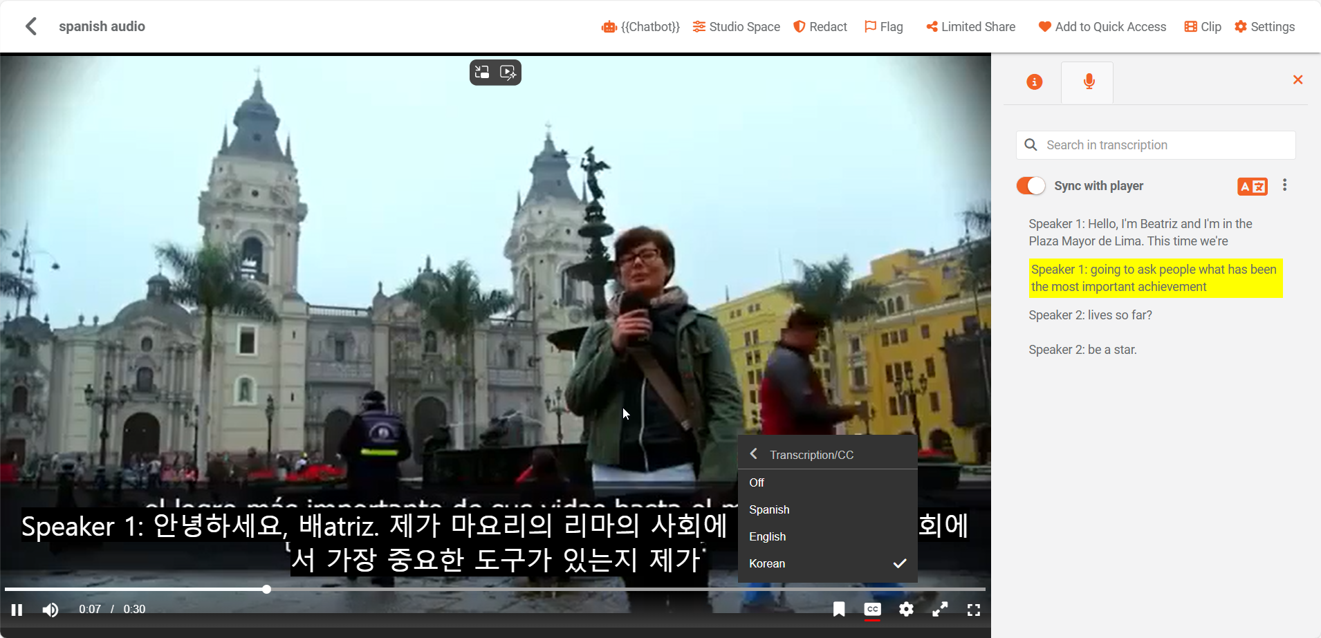 Note: Studio Space supports generating transcriptions but does not support generating translations directly. To generate translations, use automatic processing, custom upload, or the Process Modal. Once translations are processed, you can view them in Studio Space.