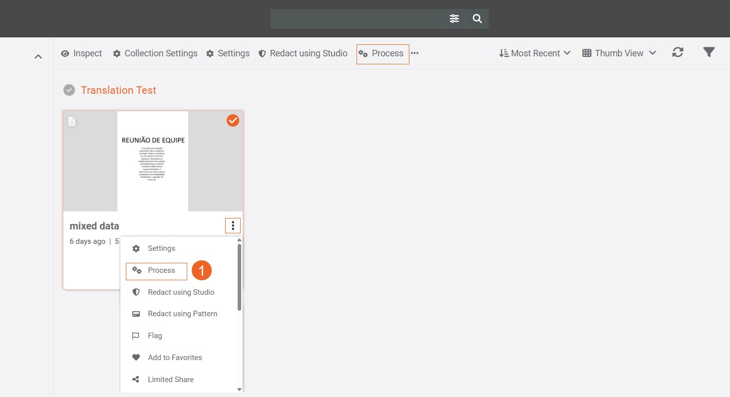 - Go to the file or files you want to translate. From the overflow menu (or the header menu if you’re selecting multiple files), choose Process.