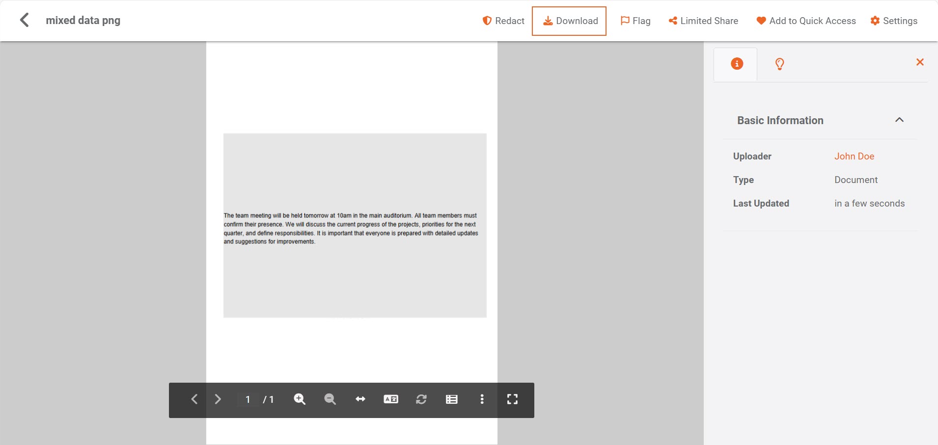 If downloading is enabled for the media file, you can download either the original or translated version directly from the document or image viewer.