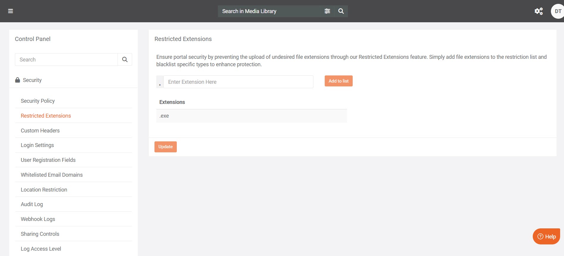 VIDIZMO enables organizations to define and manage a list of file types that are considered unsafe or unnecessary within their environment. This capability provides an added layer of security and administrative control over the content uploaded to the portal.Through the Restricted File Extensions feature in the Control Panel > Security, admins can define and manage a list of unsafe or unwanted file extensions. By blacklisting specific file types, organizations can prevent the upload of undesired content and maintain a secure, compliant environment.