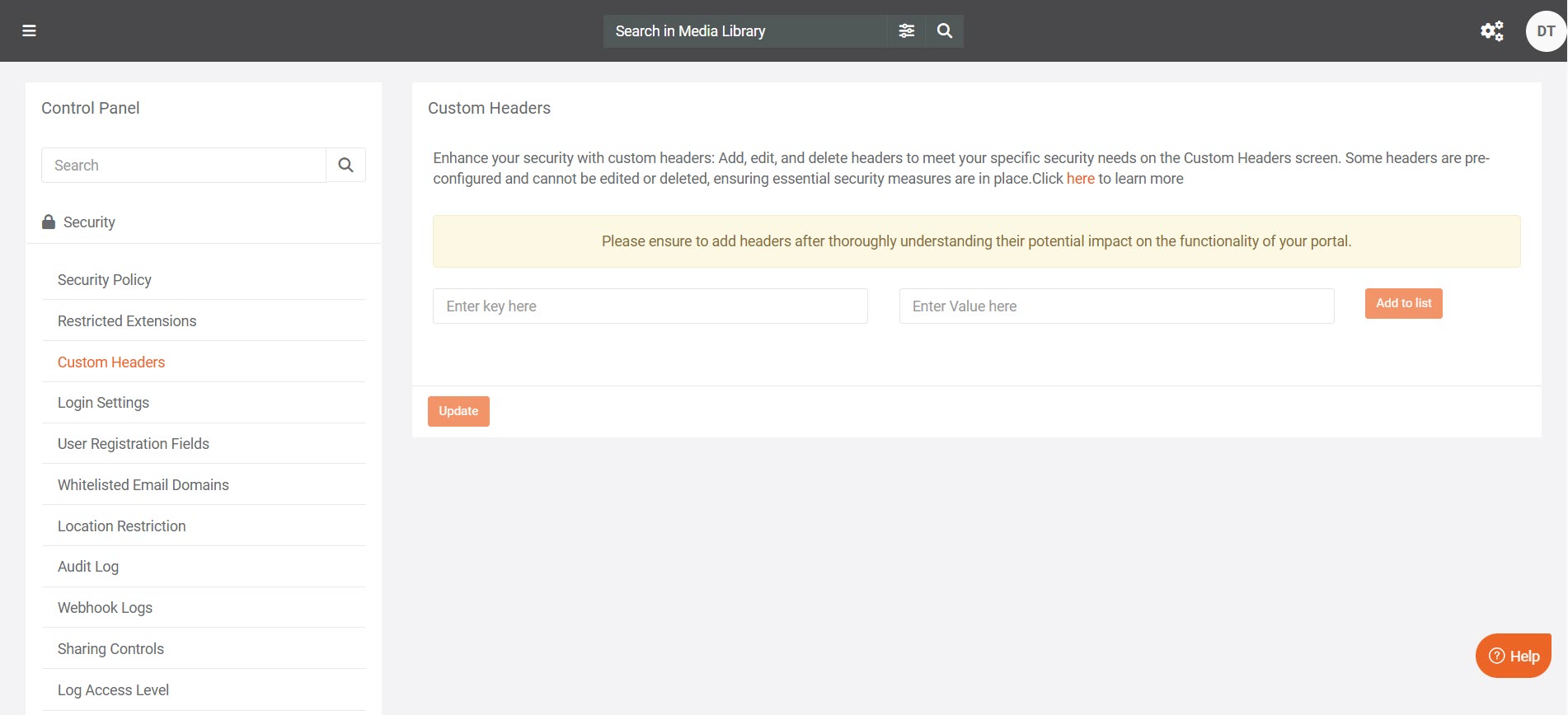 Enhance your portal’s security with Custom Headers in VIDIZMO. This feature allows portal managers to add, edit, or delete HTTP headers to meet specific security requirements and strengthen communication between clients and servers. The Custom Headers feature provides flexibility to configure headers that align with your organization’s security policies, helping to mitigate potential vulnerabilities and improve overall security posture.