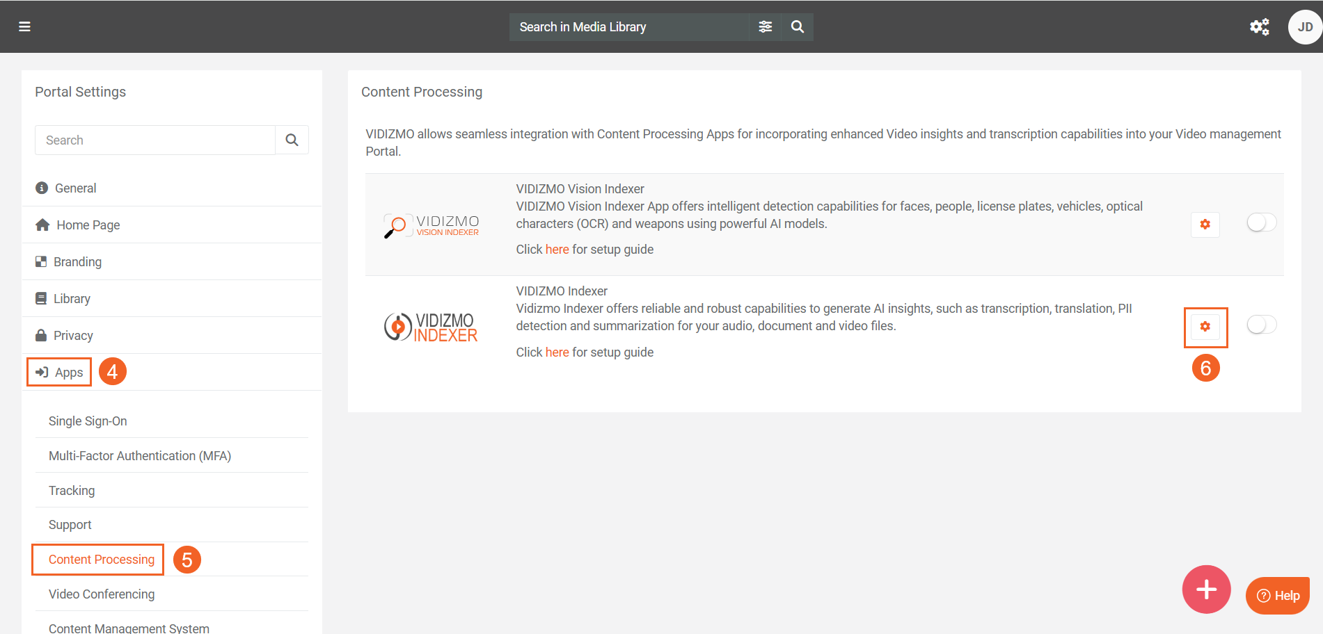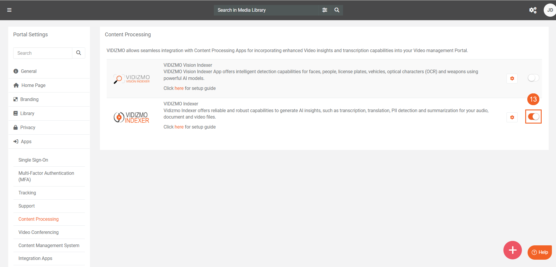 - Select Content Processing to view available processing apps. Locate VIDIZMO Indexer.
