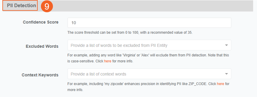 - Confidence Score: Set the confidence score for the model to recognize a detected term as a PII entity. A term is classified as PII only if its confidence exceeds this minimum value. The confidence score can be set from 0-100. Recommended: 35.