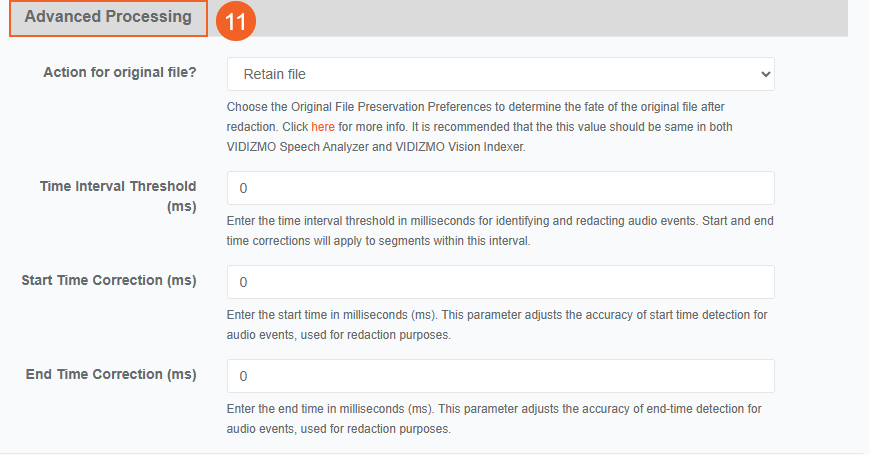 Time Interval Threshold: Specify the time interval threshold (in milliseconds) for more accurate redaction of PII. The threshold value determines which PII detections are selected during audio activity detection, and then applies the configured Start Time and End Time corrections to the audio segments for complete redaction.