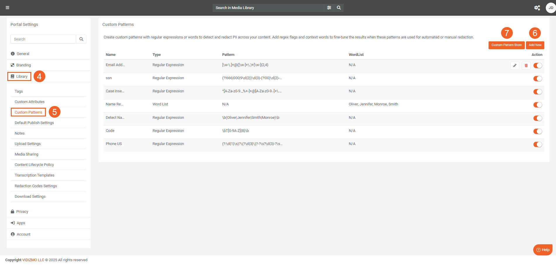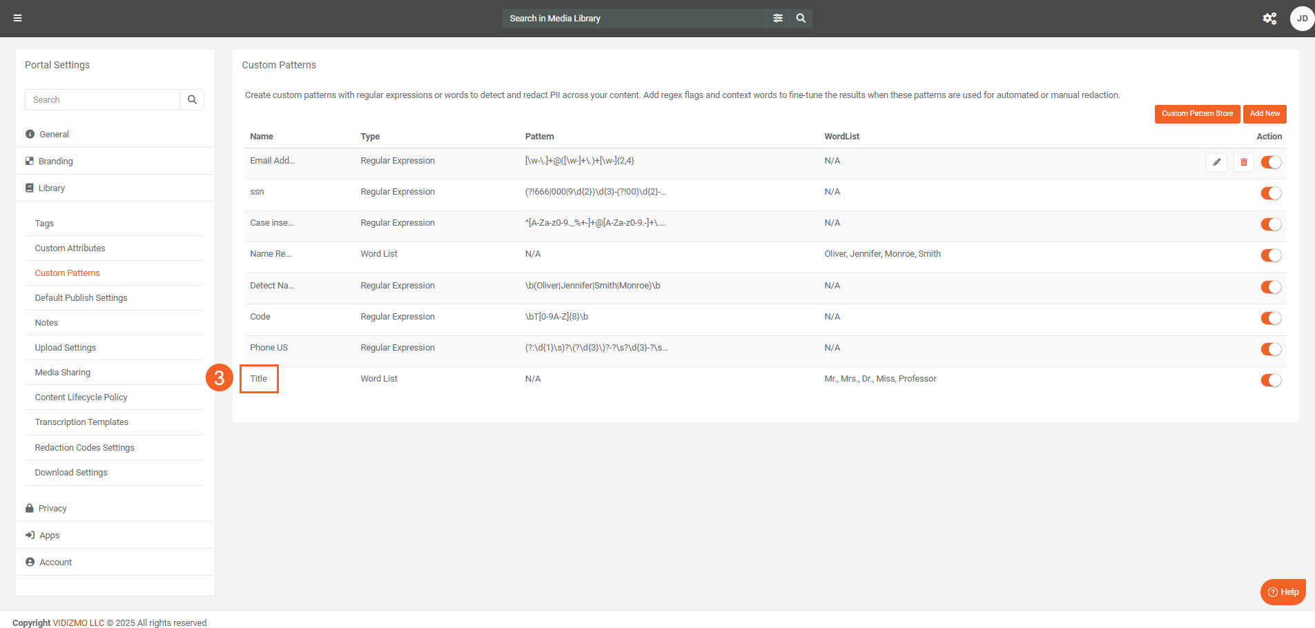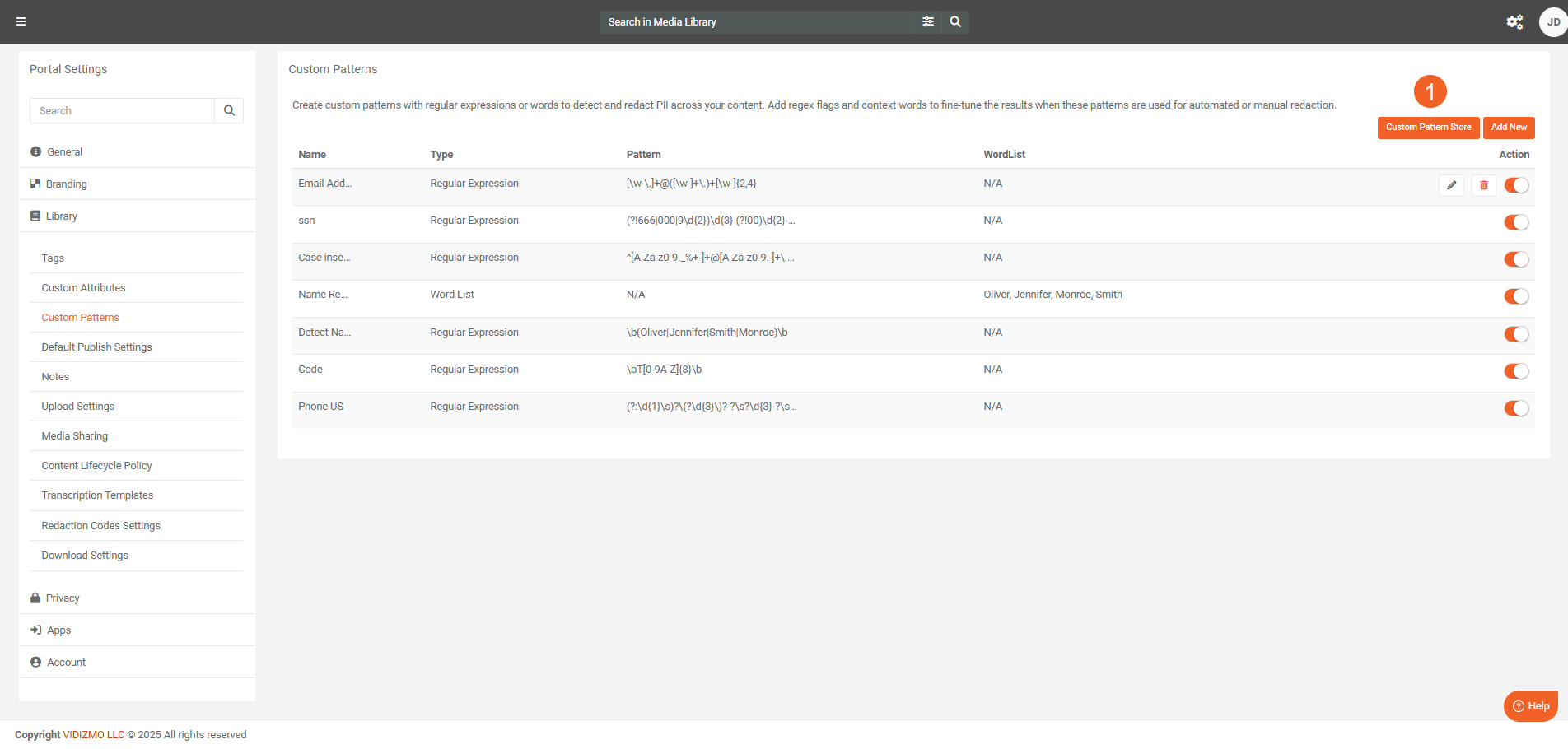 VIDIZMO lets you create custom patterns to define personally identifiable information (PII) entities for the VIDIZMO Indexer. These patterns are applied when Custom PII is selected as a detection type during content processing. This enables the VIDIZMO Indexer to detect and redact user-defined PII entities in transcriptions or on-screen text (via OCR) from your content.