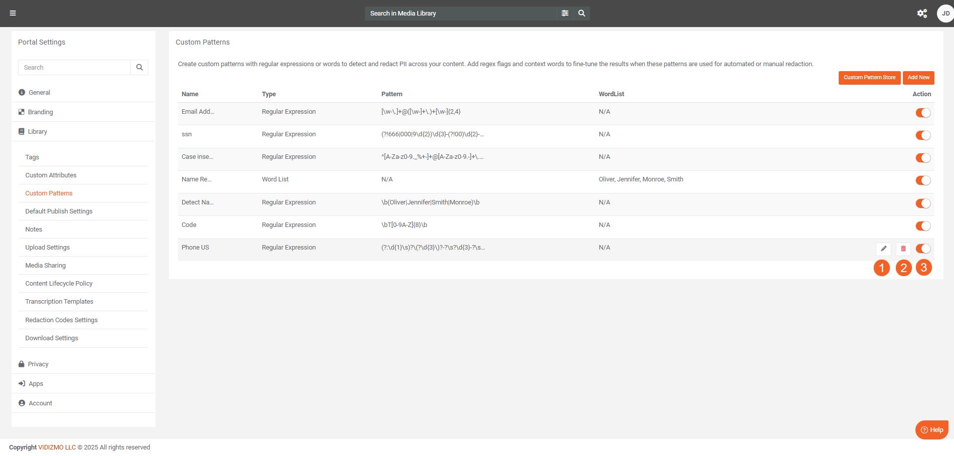 - Enable/Disable: Use the toggle to turn the pattern on or off. Disabled patterns aren’t used by the VIDIZMO Indexer when Custom PII is selected