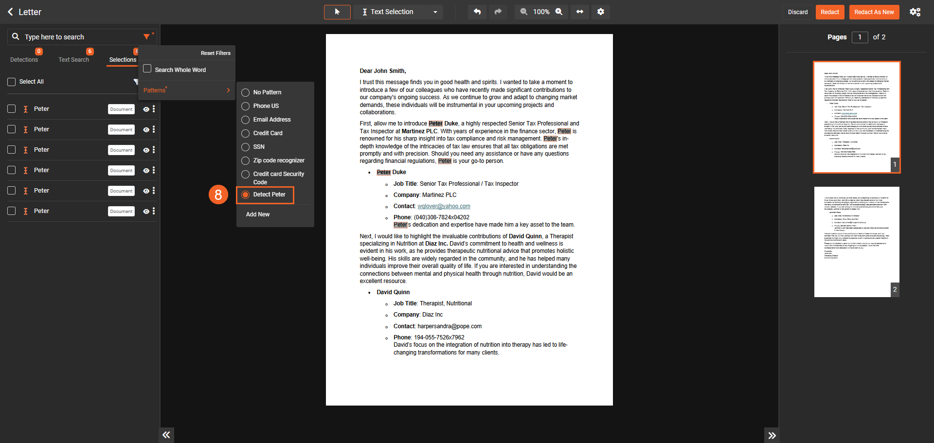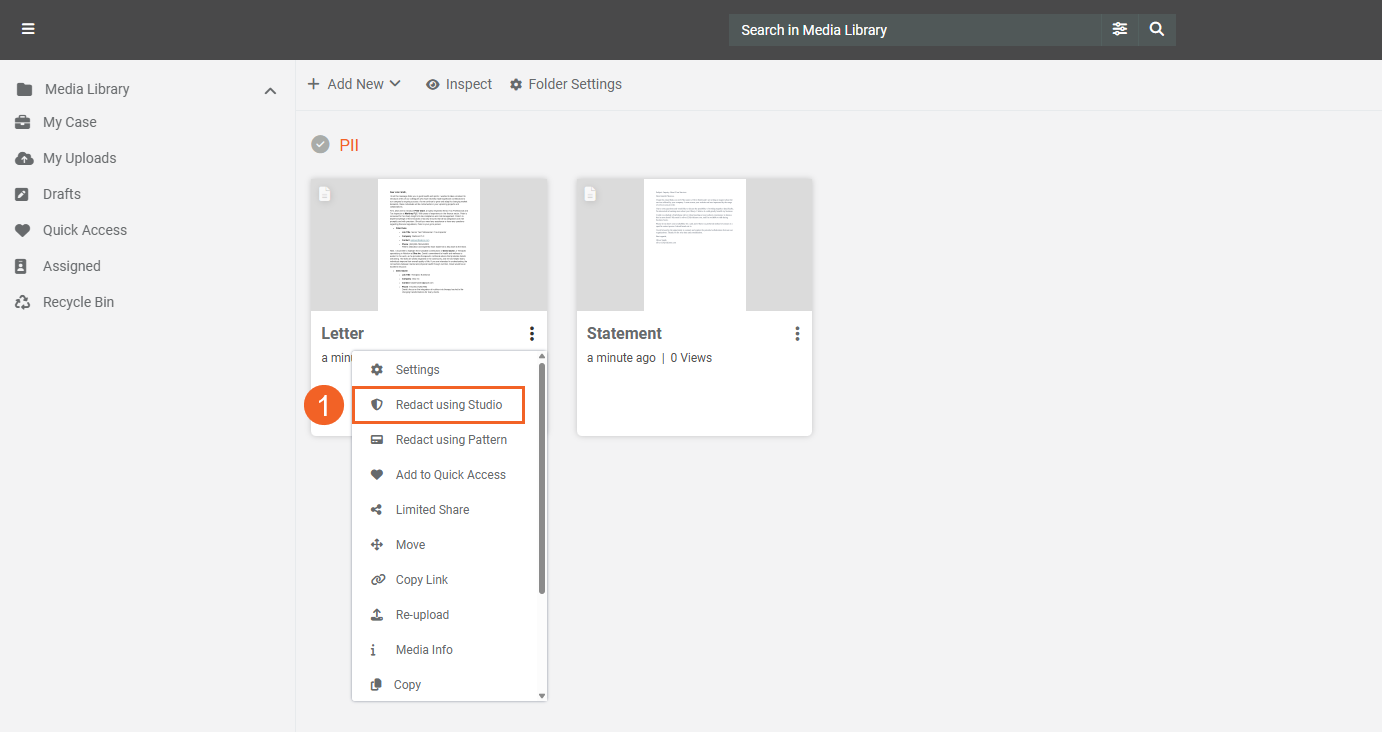 Note: Document redaction in Studio Space currently supports Regular Expression patterns only. Word list and Context Words with Regex aren’t available.