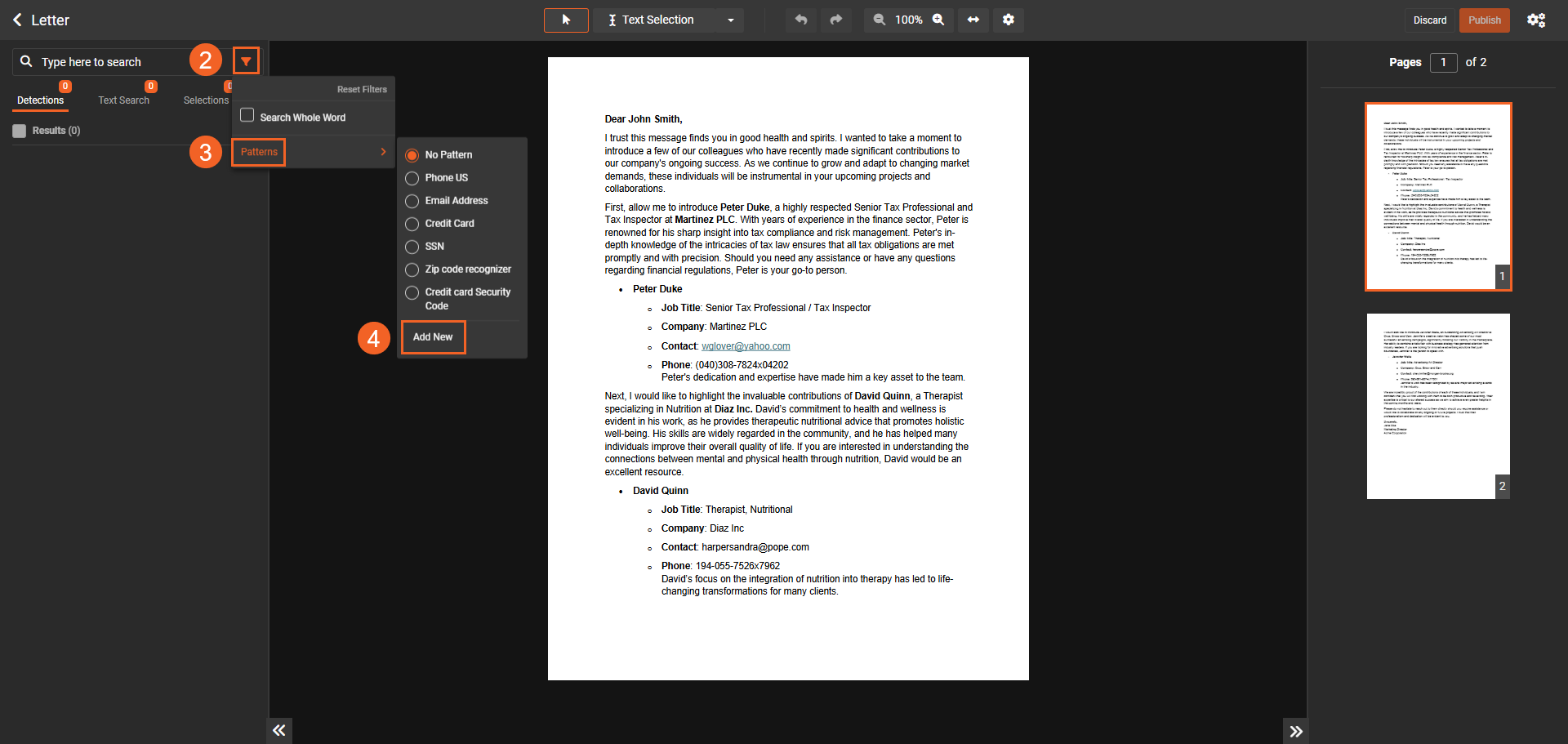 - In the Pattern drop-down, choose your new pattern to highlight matching text in the document.
