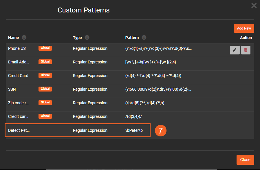 - On the Custom Patterns screen, all existing regex-based custom patterns are listed. Select Add New to add a new pattern.