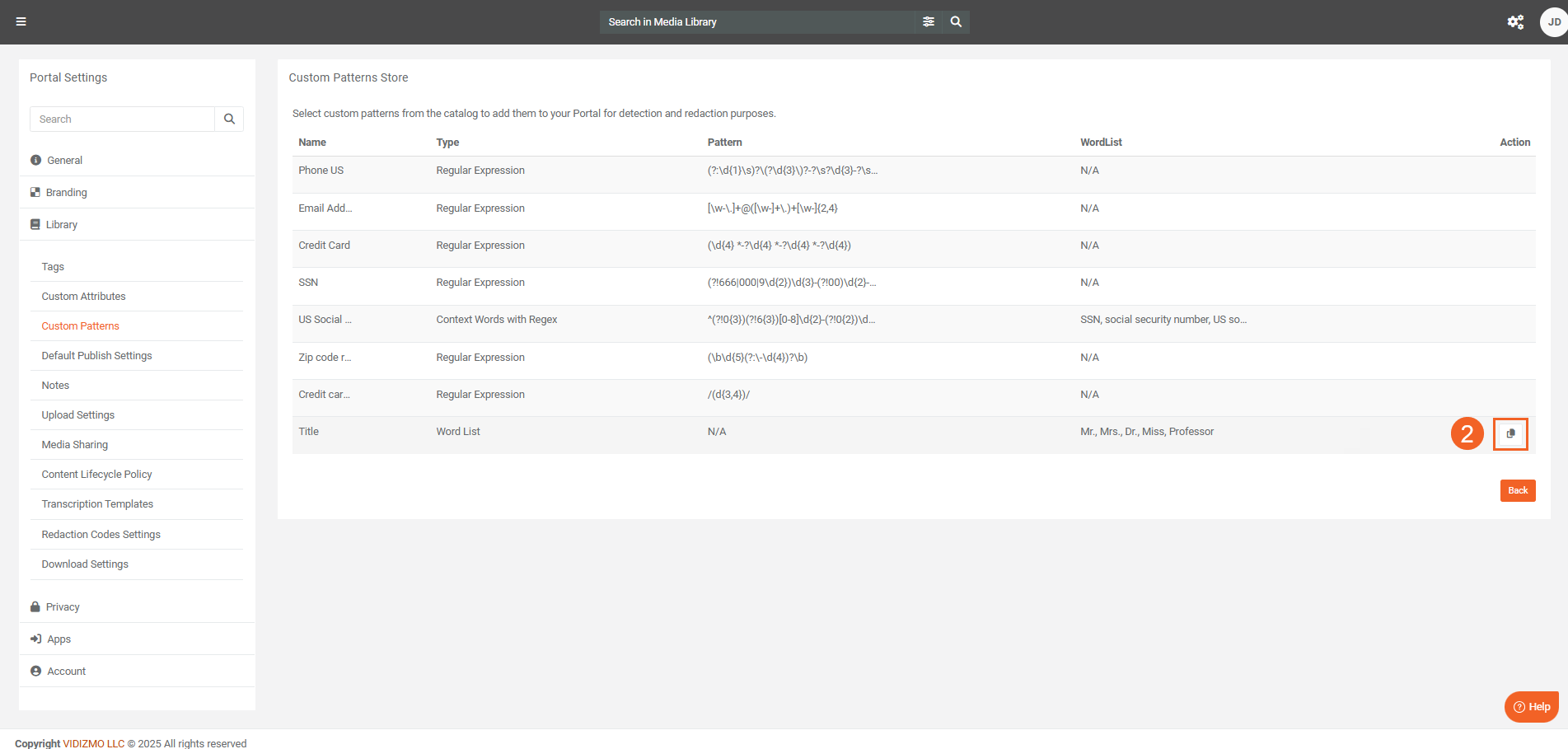 If you’re redacting a document in Studio Space, you can create new custom patterns. See How to Perform Document Redaction in VIDIZMO for more details.