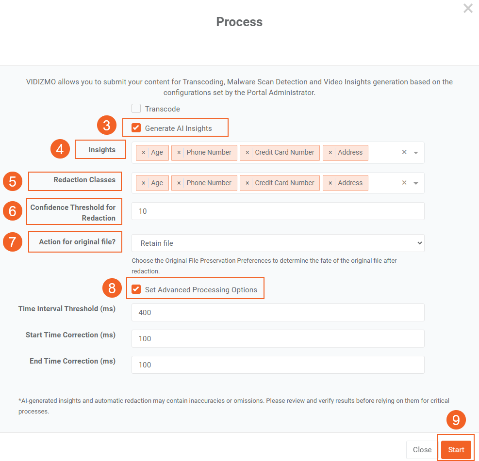 - On the Process Modal, select "Generate AI Insights" to display the processing options.