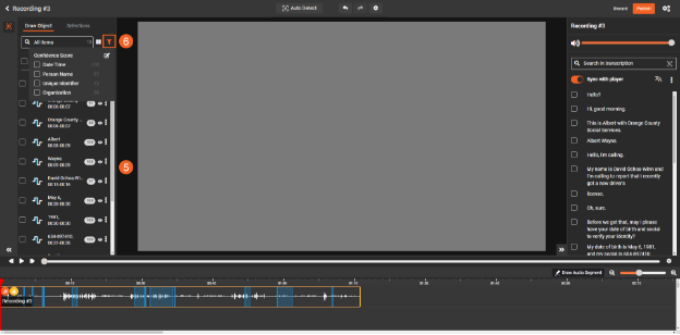 - The detected PII entities will be displayed on the pane on the left side along with additional information such as their confidence score and timestamps. You can also click these detections to navigate to the instance or time of when this object was detected or when this PII was spoken. Additionaly, PII that is detected within the audio is represented with a waveform icon, you can view this on the Audio PCM wave at the bottom.