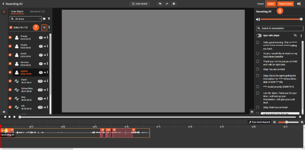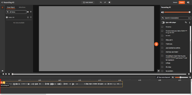 - After the processing is finished, the PII you've selected will be redacted as seen in the transcription. They won’t be available as detections on the left pane as well.