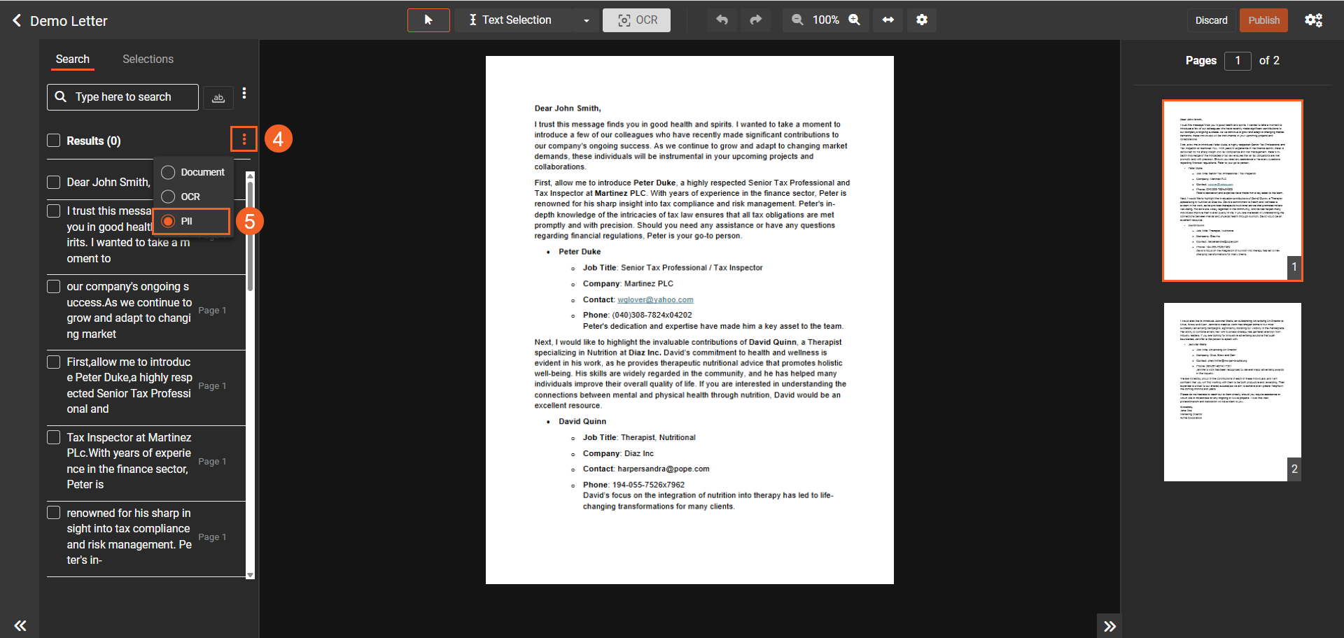 Select PII to display all PII detected by the OCR processing on the document. You can then choose to seletively redact these PII from your document similar to Step 7 and onwards in the PII Detection and Redaction via Studio Space section.