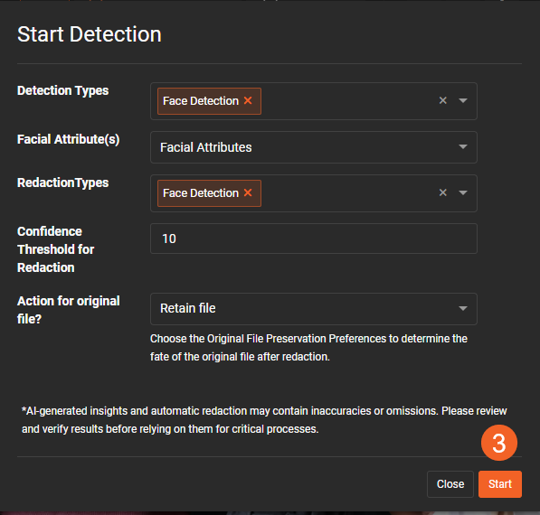 - Within the Start Detection modal, add Face Detection into the Detection Types, and choose the specific attributes you intend to predict. Initiate the workflow for the Detection Activity by clicking the Start button.