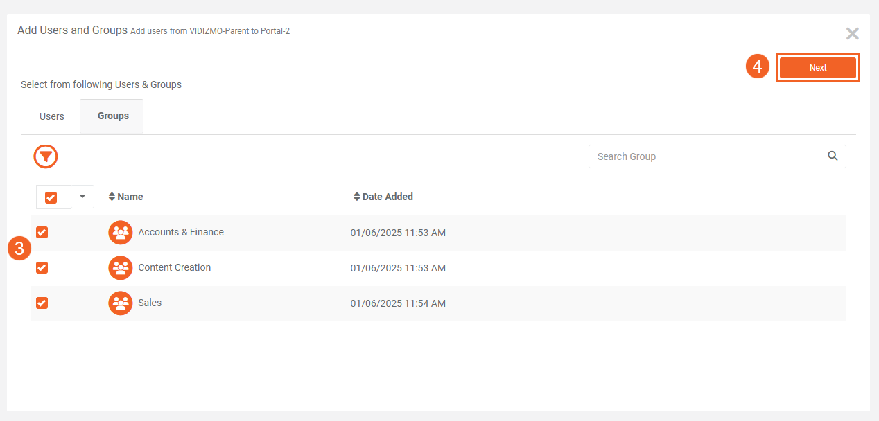Note: As VIDIZMO allows you to create nested groups (groups inside groups), copying a nested group from Account to a sub-portal, performs a deep copy, that is, copies all members of the copied group as well its nested members, if any.