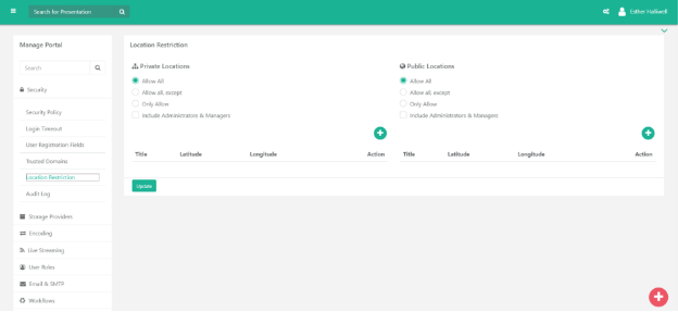In VIDIZMO, Location Restriction feature is accessible from the Control Panel > Security > Location Restriction tab. Restriction can be applied to Private or Public Locations using the following options: